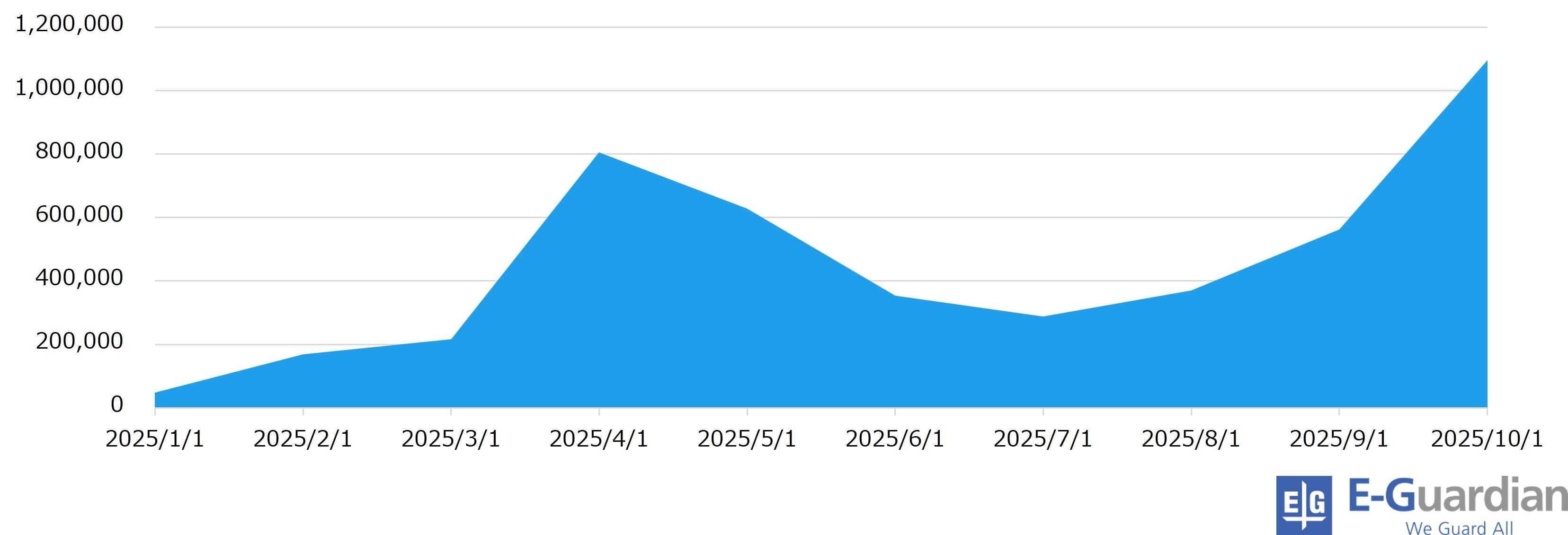 『ミャクミャク』話題量 月次推移(2025年1月1日〜2025年10月31日:リポスト込み)