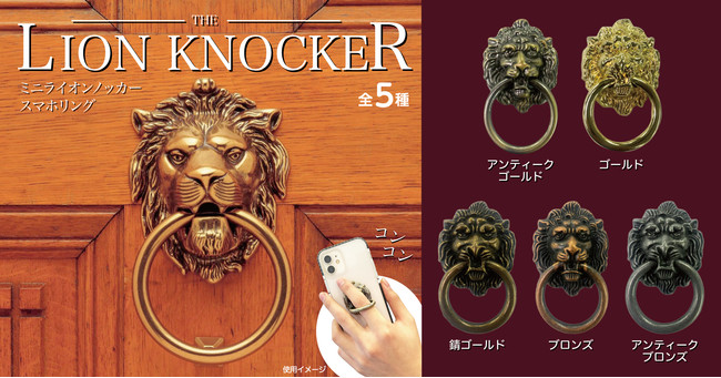 昔の大豪邸の象徴としてフロントドアに異彩な存在感を放つライオンノッカーを小さくコンパクトにし、スマホリングにすることで、何とも可愛らしい一品。