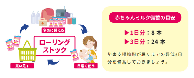 災害時に備え、普段から使い慣れた製品をローリングストックすることが、乳児の防災備蓄では大切になります。普段使うものを少し多めに備蓄し、賞味期限の近いものから使って、使った分を補充しましょう。