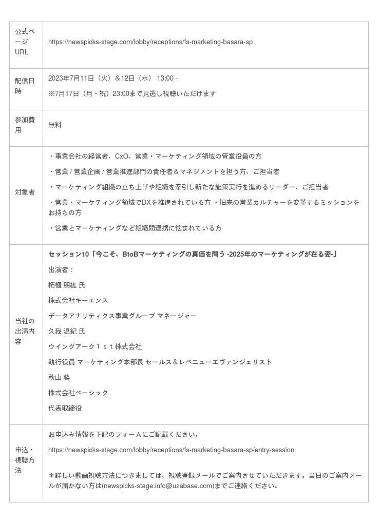 BtoBマーケティングのお困りごとをまるっと解決するサービス『ferret One(フェレットワン)』を運営する株式会社ベーシック(本社:東京都千代田区、代表取締役:秋山勝、以下「当社」)は7/11(火)、7/12(水)に株式会社ユーザベース(本社:東京都千代田区、代表者:稲垣裕介 / 佐久間衡)が運営するNewsPicks Stage.の営業&マーケティング情報番組『Marketing BASARA』に出演いたします。