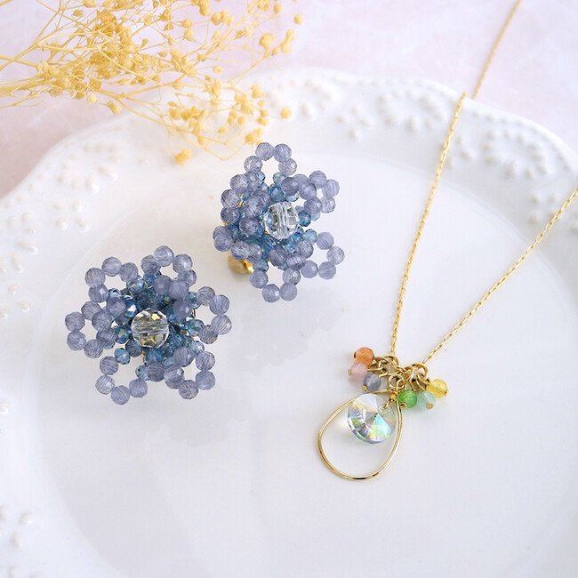 カット、大きさの違うカットビーズを使用する事で動くたび異なる輝きを楽しむことができます。