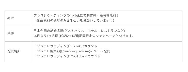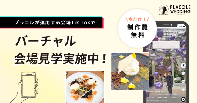 「PLACOLE & DRESSY」ブランドを展開する、冒険社プラコレ(本社:神奈川県鎌倉市、代表取締役CEO:武藤功樹)は、プラコレウェディングのTIkTokを活用しながらバーチャル式場見学ができるサービス、本日より1ヶ月間(10/26~11/25)期間限定の制作費・掲載費無料キャンペーンく実施することをお知らせいたします。