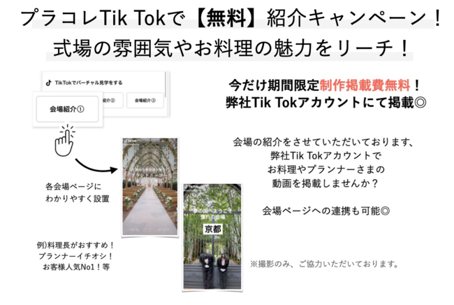 今回、多くの新郎新婦さまに楽しんでいただいているプラコレウェディングのTikTokにて期間限定制作費・掲載費も無料で公開するキャンペーンの実施を開始。 (動画素材の撮影のみお手伝いをお願いしています!)TikTok動画の作成&公開はもちろん、 プラコレ編集部(@wedding_adviser)のリール配信・YouTubeのショート動画を活用したアプローチ、プラコレウェディングの会場ページへのリンクなども可能となっております。