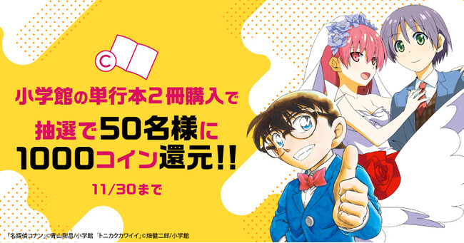 小学館作品配信開始を記念して、小学館の単行本を2冊購入いただいたお客様50名様に抽選で1000コイン(1000円相当)を還元いたします。