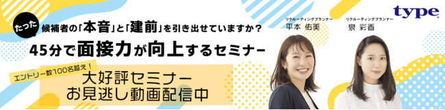 ひとつ上を目指す人のキャリア転職サイト『type』、正社員で長く働きたい女性のための転職サイト『女の転職type』は、中途採用担当者様向けのオンラインセミナーを定期開催しております(https://info.type.jp/webinar_guide)。