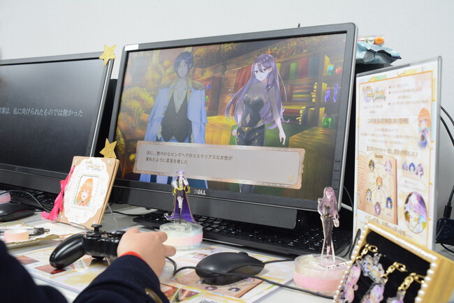 ゲーム系の3学科とキャラクターデザイン学科の学生でチームを組み、一つのゲームをつくり上げる共同制作。その作品を自由にプレイできるブースを設置していました。キャラクターの声は声優学科の学生が担当しています。中には、ゲームだけでなく、キーホルダーやアクリルスタンドなど、オリジナルグッズを作っているチームも。さらに別の教室では、企業の方をお招きし、1年生が初めて本格的に開発したゲーム作品の講評会を行いました。