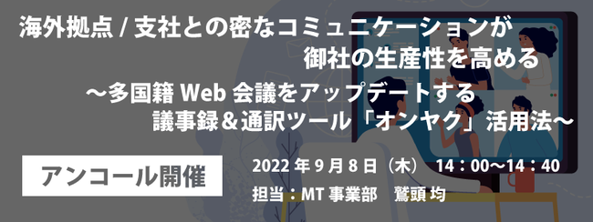 AI自動翻訳のロゼッタ ウェビナー『海外拠点/支社との密なコミュニケーションが御社の生産性を高める 〜多国籍Web会議をアップデートする議事録&通訳ツール「オンヤク」活用法〜』9月8日(木) 開催