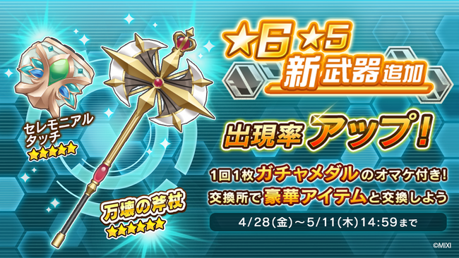 4月28日(金)メンテナンス後〜 5月11日(木)14:59まで新規武器★6「万壊の斧杖」★5「セレモニアルタッチ」が武器ガチャより、出現率アップで登場します。