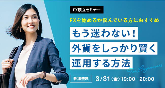 FXを始めるか悩んでいる方、FXをゆったり取り組みたい方に向けたFX積立セミナー『もう迷わない!外貨をしっかり賢く運用する方法』を3月31日(金)に開催いたします。