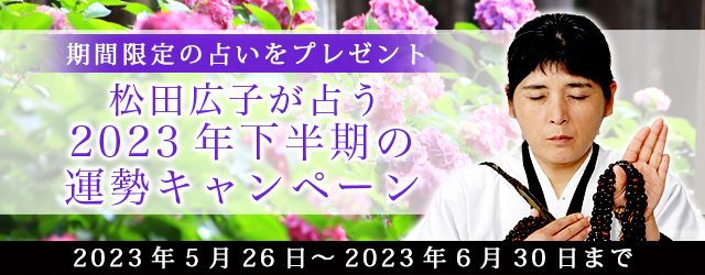 松田広子の公式占いサイト「恐山の秘術【最後のイタコ】松田広子」では、『2023年下半期の運勢キャンペーン』を開催中です。本キャンペーンでは、期間中対象の鑑定を占っていただいた方に「2023年下半期特別鑑定」をお贈りいたします。特別鑑定は、あなたの下半期の運命について更に詳しくお伝えできる鑑定となっております。期間限定のキャンペーンとなっておりますので、皆様この機会に是非、松田広子の鑑定をお楽しみください。