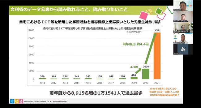 また、すららネットが2019年から積極的に啓蒙活動を行っている同調査内「自宅におけるICT等を活用した学習活動を指導要録上出席扱いとした児童生徒数」(通称:不登校生の出席扱い制度)においては前年度から8,915人(439%)増の1万1541人と過去最多となりました。その背景には、コロナ禍の自宅でのオンライン学習の利用という後押しが少しあったこと、GIGAスクール構想により、ほとんどの自治体で1人1台のタブレット端末が配布されたことが影響を受け、出席扱い制度の利用者が増えてきたことを、すららネットの佐々木が解説しました。