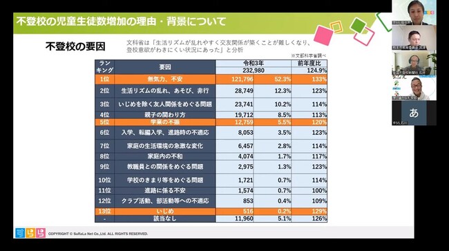 アダプティブな対話式 ICT 教材の開発と提供を行う株式会社すららネット(本社:東京都千代田区、代表取締役:湯野川孝彦)では、2022年10月に文部科学省から公表された「令和3年度 児童生徒の問題行動・不登校等生徒指導上の諸課題に関する調査結果について」を受けて、2022年11月4日(金)に「不登校児童20万人時代に、考えたいこと」を開催しました。