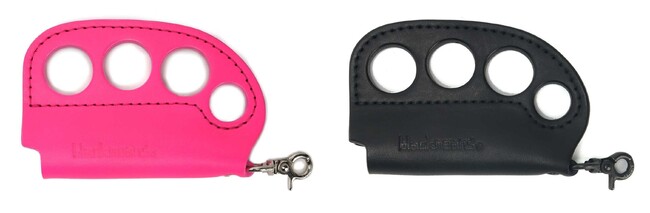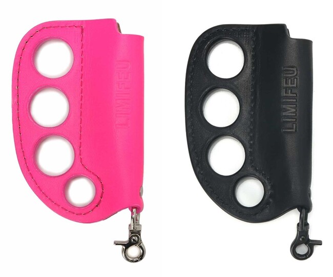 レザーのナックルライターケースのピンクには、LIMI feuのショッパーカラーであるネオンピンクを採用し、コバを赤で仕上げている。ボディには両ブランドのロゴをエンボス加工で配しており、カラビナにはデジタルフォントのLIMI feuロゴを刻印。職人がひとつひとつ手作業で作り上げるライターケースは、手に馴染みやすく、使い込むほどに自分専用のテイストに変化していく。