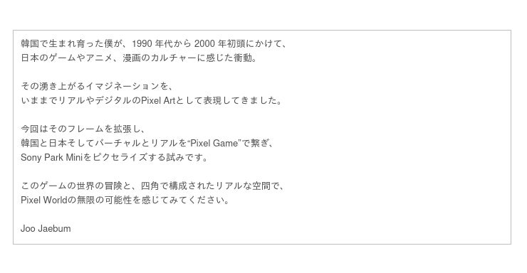 今回は、アーティスト自身の実験的な試みとして、ピクセルのゲーム作品「Pixelized Adventure in Japan」を体験展示します。主人公の “JOO” が韓国のアトリエを出発し、東京各地で様々なミッションをクリアしながら、ひとつのアート作品を完成させ展示会場に届ける、というもので、本プログラムの開催を冒険に見立て、「韓国」と「日本」をつなぐ物語をゲームで表現した作品です。また、このゲームの中に登場する様々なアイテムを、リアルな立体的ピクセルアートとしてSony Park Miniの空間に展示、さらに期間中は併設する西銀座駐車場コーヒーのカップのロゴステッカーもピクセル仕様になるなど、「ゲームのバーチャル世界」と「ピクセル化したリアル空間」がつながる体験をお楽しみいただけます。