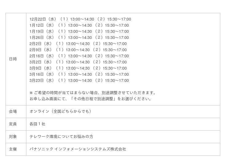 パナソニック インフォメーションシステムズ株式会社は、2021年12月から2022年3月の毎週水曜日に、テレワークのためのITインフラにフォーカスしたWeb個別相談会を開催します。