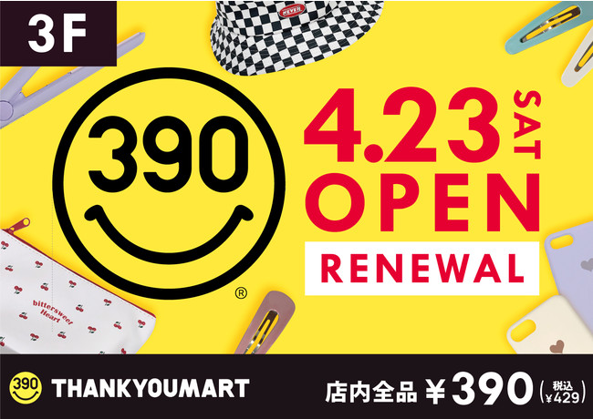 エルソニック株式会社(本社:大阪府吹田市)は、全国で106店舗を展開する390円ショップ『サンキューマート』イオンモール岡山店が2022年4月23日(土)にリニューアルオープン致します。