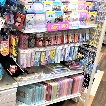 キャラクターソックスもまさかの2足で390円。ディズニーやワンピースなど、30種を超えるキャラクターアイテムを展開しています。