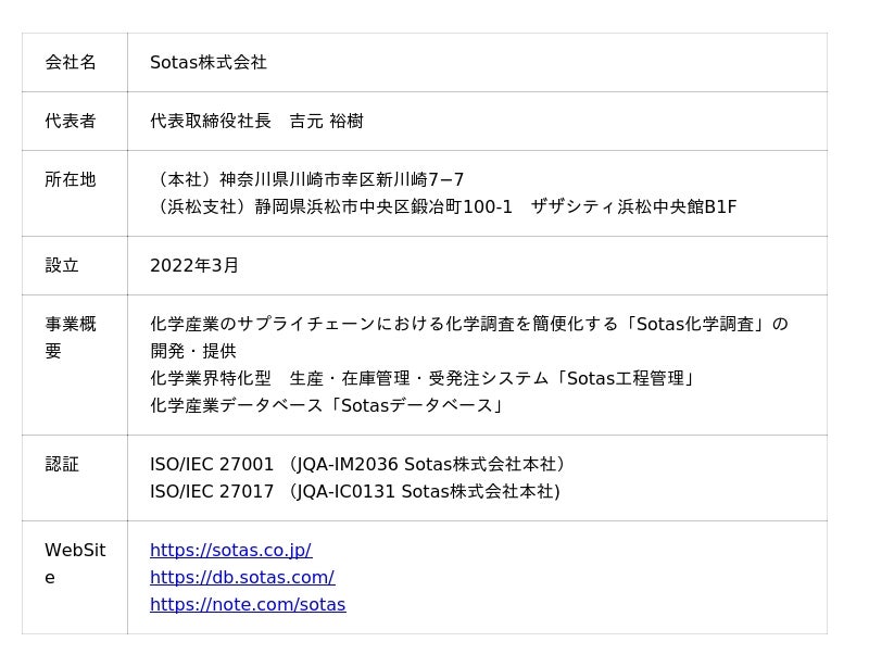 SotasはこのCMPの助成事業に参画し、化学産業における情報伝達基盤の社会実装に向けた取り組みを通じて、持続可能な産業循環と国際競争力強化に貢献してまいります。