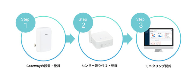 利用に必要なセンサーやゲートウェイ、マニュアルが全てパッケージになっており、手元に届いたその日から3ステップで簡単に取り付け・設定ができ、計測を開始します。