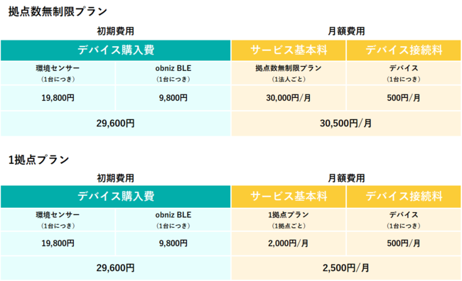 クラウドを活用した先進のobniz(オブナイズ)ゲートウェイや、Bluetooth(R)やWi-Fi回線を活用した各種センサーを使用することで、初期費用のデバイス購入費を最小構成の2万円台と抑えることができます。さらに多店舗のチェーン展開をする企業でも、サービス固定費が月額3万円、デバイス接続料が月額500円(1台あたり)と低コストで導入できます。