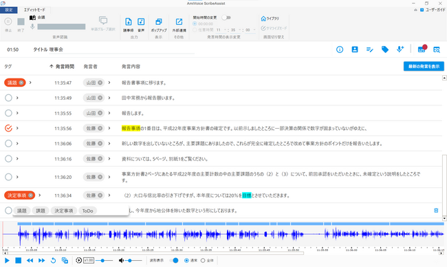 AI話者識別機能やキーワード・タグ付け機能、リアルタイム字幕表示機能、議事録作成に特化したファシリテーションモードなど、会議での運用に適した機能を多数搭載しています。