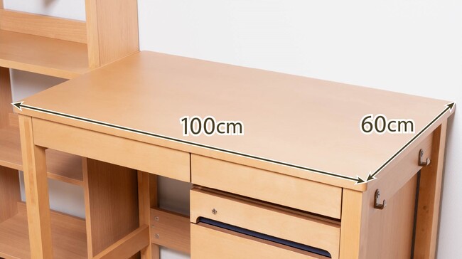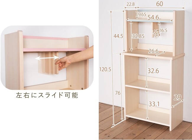 教科書や図鑑など、大きな本も収納できる書棚です。書棚(上の段)のスライド仕切板は左右にスライドできるので、収納したいものに合わせて調節可能。棚板奥にはモノの落下を防ぐ小さな背板付きです。