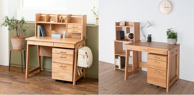「色を楽しむ」がコンセプトのデスク、ジョイカラーには同シリーズ初となるバーチ材天然木を使用し、定番の学習机である「ベーシックデスク」と、書棚・デスク・ワゴンがセットになった「ユニットデスク」の2タイプが登場。