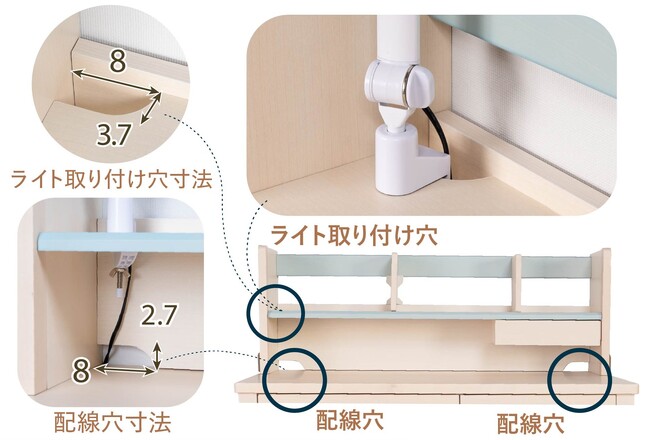 デスクの上棚には棚板と背板に配線穴があり、電源タップなどの乱雑になりがちな配線を整理し、デスクをすっきり整頓できます。また、棚板の穴にはクランプ式ライト(※1)を取り付けることもできます。