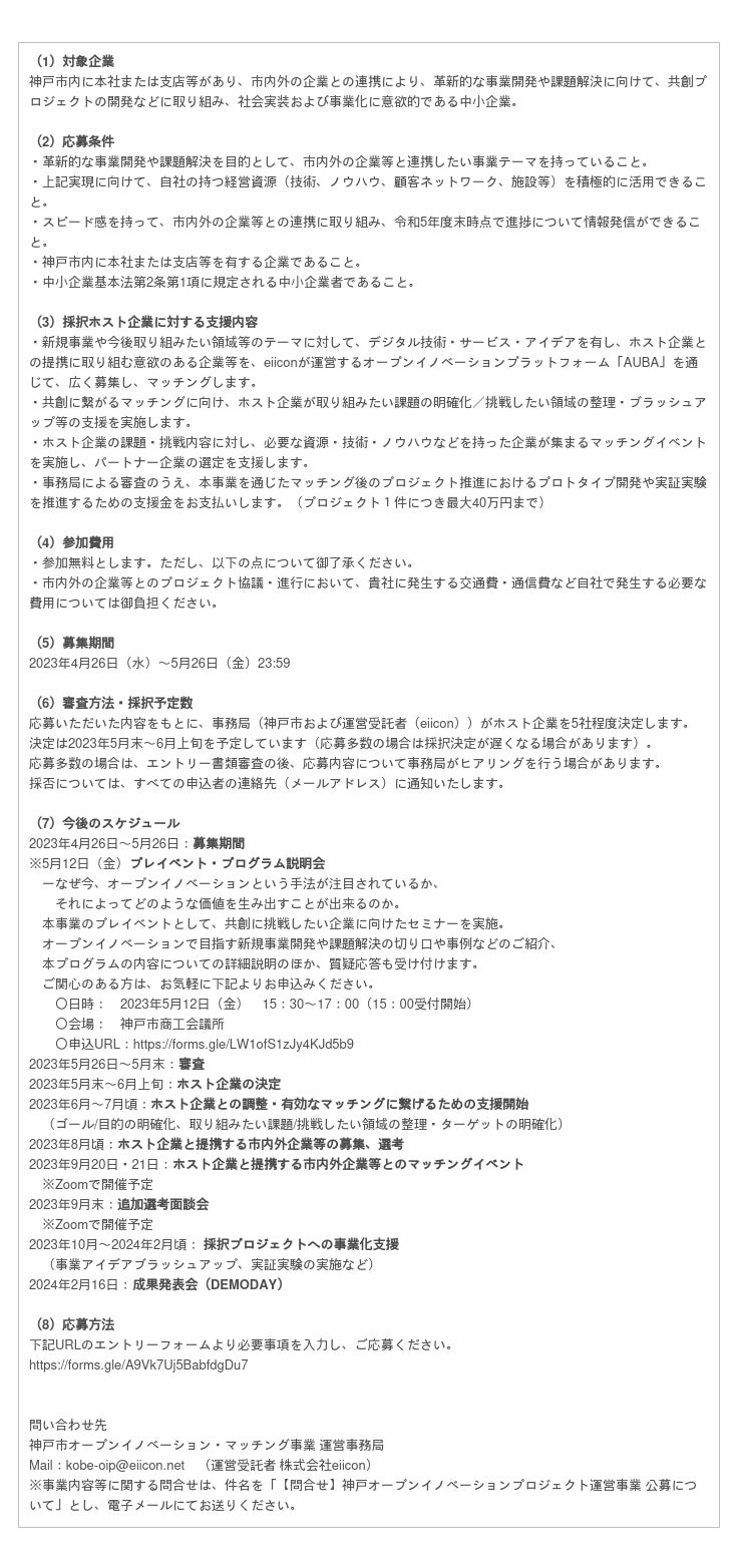 本事業の核となる取り組みとして、神戸市内事業者を対象に、新たな事業開発や課題解決にチャレンジしたいホスト企業の募集を2023年4月26日より開始します。