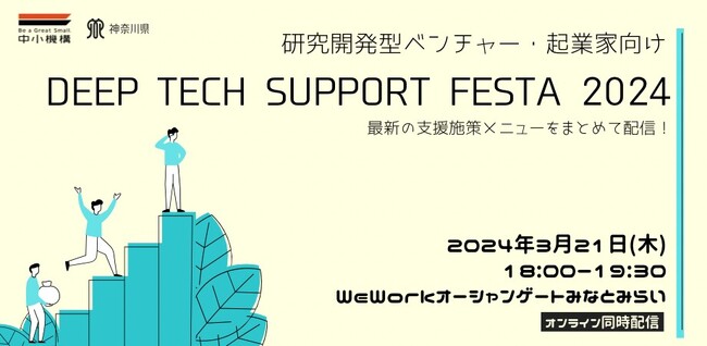 県では、県経済を牽引するベンチャー企業の創出と成長に向け、様々な事業に取り組んでいます。 このたび、研究開発型ベンチャー企業等を対象に7つの公的機関の支援施策を紹介するとともに、支援機関と交流できる機会を提供するイベント「DEEP TECH SUPPORT FESTA 2024〜最新の支援施策メニューをまとめて配信!〜」を開催しますので、お知らせします。
