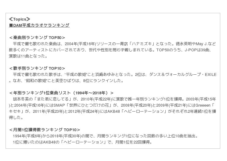 株式会社第一興商は、「平成最後の年末」に合わせて、通信カラオケDAMがサービスを開始した1994年(平成6年)4月から2018年(平成30年)10月までのデータを集計し、「DAM平成カラオケランキング」として発表します。