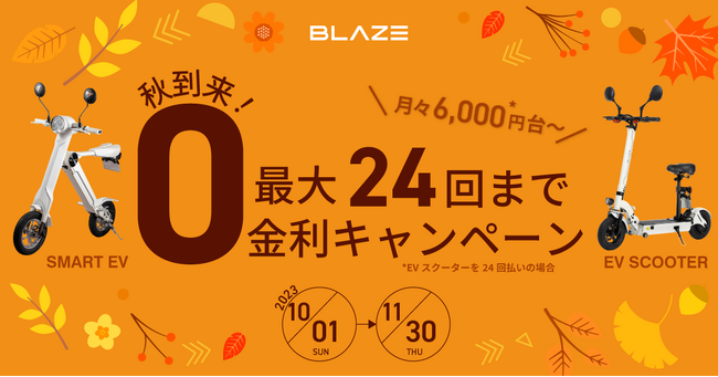 株式会社ブレイズ(愛知県名古屋市、代表取締役:市川秀幸、以下ブレイズ)は、2023年10月1日(日)〜11月30日(木)の期間、電動バイク「ブレイズ スマートEV」または「ブレイズ EVスクーター」をローンでご購入のお客様に対して、利息分をブレイズが負担する「ゼロ金利キャンペーン」を実施いたします。