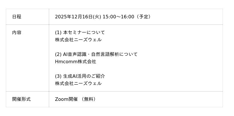 株式会社ニーズウェル(本社:東京都千代田区、代表取締役社長 松岡元)は、2025年12月16日(火)15時より、Hmcomm株式会社(以下、「Hmcomm」)・ニーズウェル共催の無料オンラインセミナー「AI音声認識・応答のコンタクトセンター 〜AI音声認識・応答の”人に優しい問い合わせ対応”を実現します〜」を開催します。