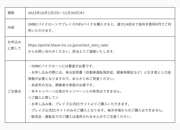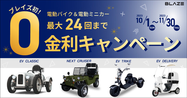 株式会社ブレイズ(愛知県名古屋市、代表取締役:市川秀幸、以下ブレイズ)は、2023年10月1日(日)〜11月30日(木)の期間、電動3輪トライクや電動4輪ミニカーをローンでご購入のお客様に対して、利息分をブレイズが負担する「ゼロ金利キャンペーン」を実施いたします。