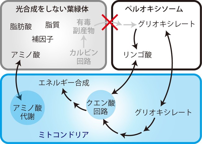 特に興味深いのは、本種の葉緑体の役割でした。本種のゲノム中には、光合成色素であるクロロフィルおよびフコキサンチンなどのカロテノイドといった色素合成遺伝子や光合成に関わる遺伝子は検出されませんでした。しかし葉緑体は光合成を止めたあとも細胞内に保持されており、アミノ酸や脂肪酸、脂質など細胞の生存に必須な多数の物質を合成していることが明らかになりました。光合成を止めた光エネルギーが利用できなくなった後も、その葉緑体はモノづくりの場として働いていることになります。さらにニッチア・プトリダは、葉緑体の役割だけでなく、細胞内での物質の移動ルートも変更していることが分かりました。真核生物の細胞内はオルガネラと呼ばれる膜で区切られた小部屋が多数存在します。光合成性の珪藻でも、葉緑体とミトコンドリア*3、そして解毒作用を担うペルオキシソーム*4が綿密に相互作用しています。しかし光合成を止めた本種では、ミトコンドリアと葉緑体、ミトコンドリアとペルオキシソームの間では物質のやり取りがあるものの、葉緑体とペルオキシソームの間の相互作用は確認できませんでした。これは、光合成を止めることが葉緑体の中だけの現象ではなく細胞全体に影響するということを意味しています。