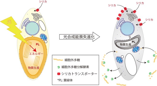 加えて、単細胞の生物では、外部からの養分の摂取が細胞膜を通じて行われることから、その細胞膜機能に着目しました。その結果、細胞外からエネルギー源となる養分および細胞壁の材料であるシリカ*5を吸収するためのトランスポーター遺伝子や、細胞外で環境変動の認識や接着・物質分解に機能するタンパク質遺伝子は、光合成を止めたあと数が増えたり多様化したりしていることも分かりました。光エネルギーを利用できない分、細胞外のエネルギー源やその他の細胞の生存に必須となる物質の確保がしやすくなるように進化していると考えられます。