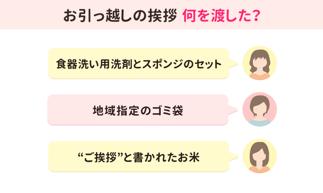 洗剤やキッチンペーパー、保存袋や地域のゴミ袋を持参した人が多いようです。さらにご挨拶などの文字が印刷されたパッケージのお米や、老舗のお菓子や地域の銘菓を手土産にした人たちも。少数派ですが「何を渡したらいいかわからないから」という理由で、金券やQUOカードなどのプリペイドカードを選ぶ人もいました。