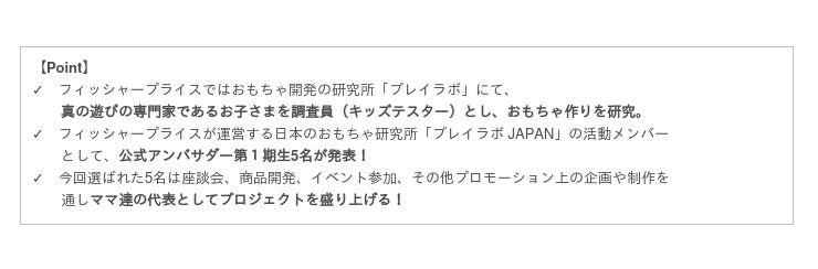五感を育てるおもちゃを開発するフィッシャープライスと一緒に、おもちゃについて考え、SNSなどを通じて一緒に盛り上げていただくことを目的とし、フィッシャープライスのコンセプトや活動に共感していただいた現役ママ達の中から選ばれました。アンバサダーのみなさんには、座談会、商品開発、イベント、その他プロモーション上の企画や制作へ、ママ達の代表としてご協力いただきます。