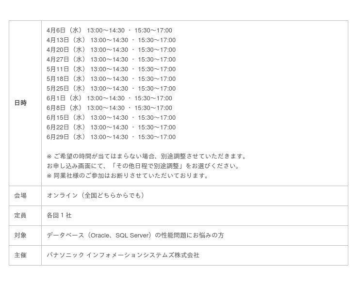 パナソニック インフォメーションシステムズ株式会社は、2022年4月6日(水)から6月29日(水)にかけて各回1社限定の、データベース性能問題にフォーカスしたWeb個別相談会を開催します。※好評につき期間延長しました。