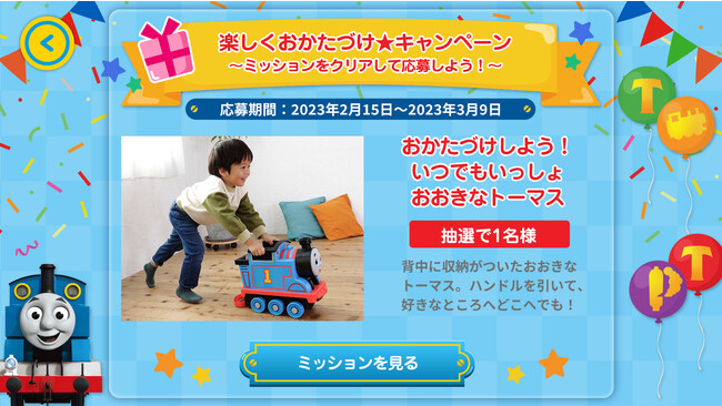 「おかたづけしよう!いつでもいっしょ おおきなトーマス」発売を記念して、1名様に商品が当たるプレゼントキャンペーンを実施します。公式アプリ「きかんしゃトーマスチャンネル!」にて動画視聴や知育ゲームプレイ、アンケート回答などの簡単なミッションをクリアすることで応募ができます。