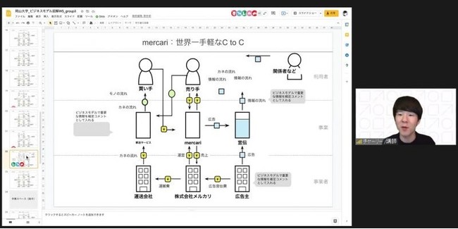 オープニングの後には、オンラインドキュメントを用いた演習を実施。参加者はフリマアプリ「メルカリ」のビジネスモデル図解演習で理解を深めたあと、各自で選んだビジネスの図解に挑戦しました。参加者は、講師から「提供するモノ・情報などが誰に対して価値を生むのかが最も重要」などのアドバイスを受けながら、熱心に演習に取り組んでいました。