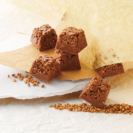 京都で丁寧に焙煎された炒り金ごまを、サクサクのフィアンティーヌ・砕いたアーモンドと合わせ、ひと口サイズのチョコレートにまとめました。金ごまは、職人がごまの香りが一番良くなる瞬間を逃さないよう丁寧に焙煎した香り豊かな炒りごまです。口に入れた瞬間から広がる炒り金ごまの香りとチョコレートとの組み合わせを楽しんでいただきたいロッシェです。