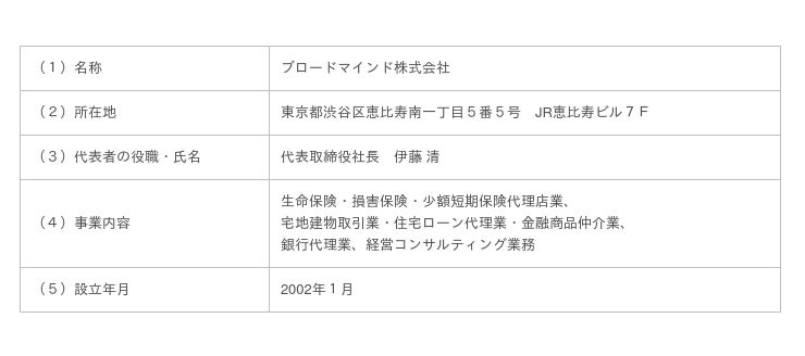 一方、ブロードマインドは、「自分らしい未来を歩む人々が溢れる世界を創る」というミッションを掲げ、保険・投資信託・債券、住宅ローンなど幅広い金融商品を取り扱い、主に個人のお客様に対して、ライフプランニングから保険の見直し・家計相談・相続対策・海外投資・不動産コンサルティングなど、様々なお金に関するニーズにワンストップでお応えするフィナンシャルパートナーサービスを提供しています。
