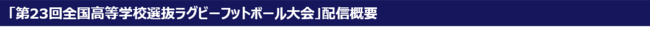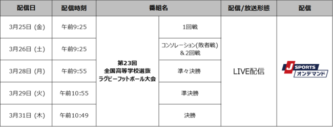 国内最大4チャンネルのスポーツテレビ局、株式会社ジェイ・スポーツ(本社 東京都江東区、代表取締役社長 長谷 一郎、以下「J SPORTS」 ※1)は、3月25日(金)から3月31日(木)にかけて熊谷スポーツ文化公園熊谷ラグビー場で開催される「第23回全国高等学校選抜ラグビーフットボール大会」を、PC、スマホ、タブレットで見られる動画配信サービス「J SPORTSオンデマンド」 ※2 で全試合をLIVE配信いたします。