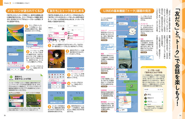 LINEの基本的な機能である、家族や友人とメッセージを送りあえる「トーク」や電話代わりに使用できる「無料通話」の使い方を初歩から説明。複数人のメンバーでコミュニケーションできる「グループ」機能も詳しく紹介しています。