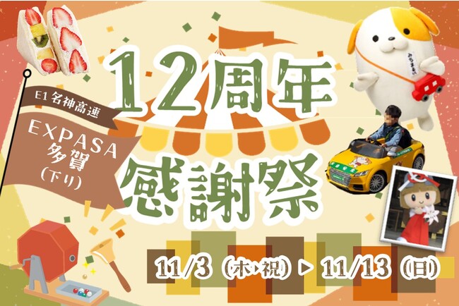 日本エクシス株式会社 滋賀支店(滋賀県犬上郡多賀町、支店長・橘(たちばな)宏和(ひろかず))は、E1名神高速道路(名神) EXPASA(エクスパーサ)多賀(下り、滋賀県犬上郡多賀町)が2010年11月3日のグランドオープンから12周年を迎えることを記念し2022年11月3日(木・祝)〜13日(日)の期間で「EXPASA多賀12周年感謝祭」を開催します。