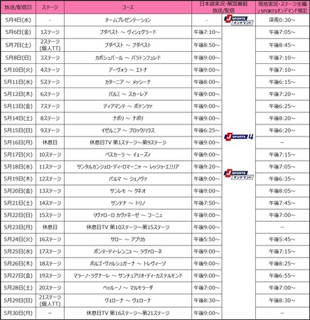 国内最大4 チャンネルのスポーツテレビ局、株式会社ジェイ・スポーツ(本社 東京都江東区、代表取締役社長 長谷 一郎、以下「J SPORTS」 ※1)は、5月6日(金)に開幕する第105回ジロ・デ・イタリアの全21ステージと、休息日に前週のレースを振り返る休息日TVを生中継します。また、PC、スマホ、タブレットで見られる 「J SPORTSオンデマンド」※2 では全21ステージのLIVE配信に加え、現地実況・解説(英語)にて全ステージの全行程をスタートからフィニッシュまでLIVE配信します。第1ステージはJ:COM及び一部のケーブルテレビ局※3 、スカパー!で無料放送、 J SPORTSオンデマンドで無料LIVE配信※4 します。