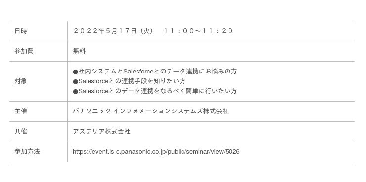 パナソニック インフォメーションシステムズ株式会社は、2022年5月17日(火)に『Salesforceとのデータ連携手法選定のコツ』にフォーカスしたオンラインセミナーを開催します。