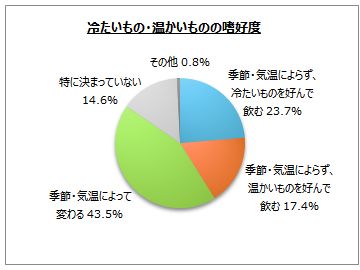 ■普段「冷たいものを好んで飲む」は2割強、男性で比率高い。「温かいものを好んで飲む」は2割弱、「季節・気温によって変わる」は4割弱で、いずれも女性の比率高い