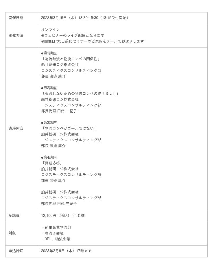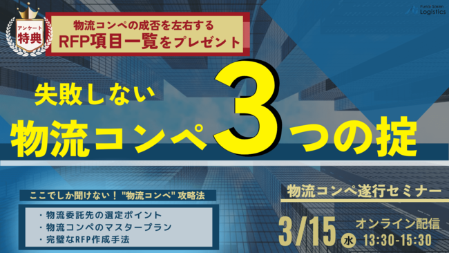 【物流コンペ攻略法】失敗しないための3つの掟をご紹介!物流コンペ遂行セミナーを3/15(水)にオンライン開催|物流コンサルの船井総研ロジ